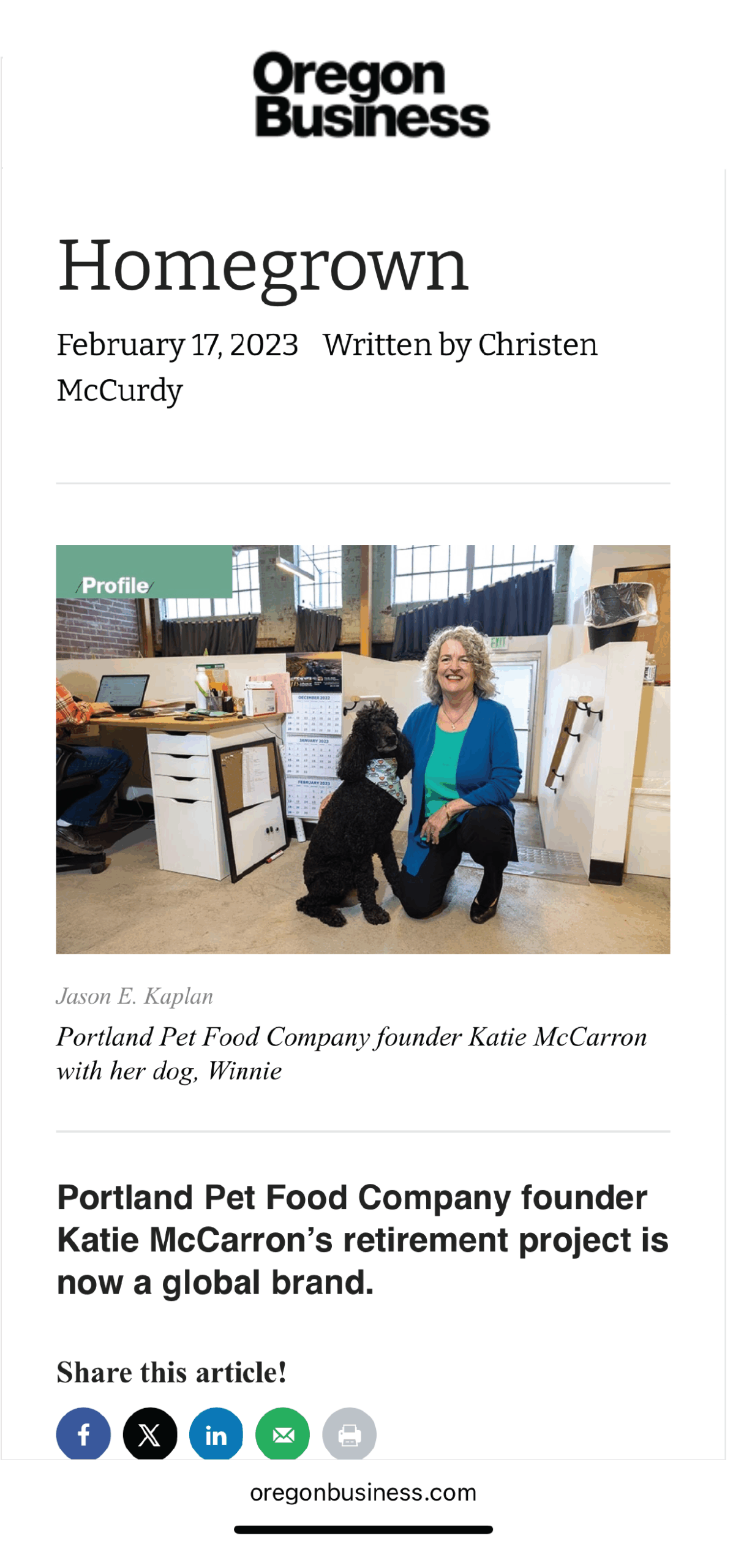 - Oregon Business: “Portland Pet Food Company founder Katie McCarron’s retirement project is now a global brand”
