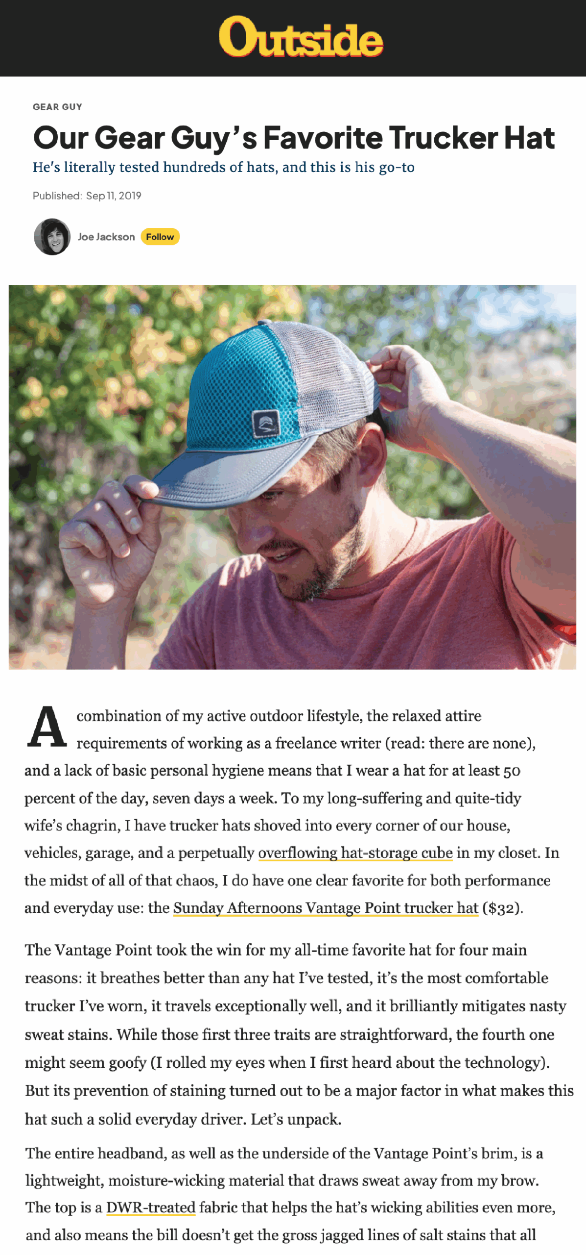 - Outside: “Our Gear Guy’s Favorite Trucker Hat”