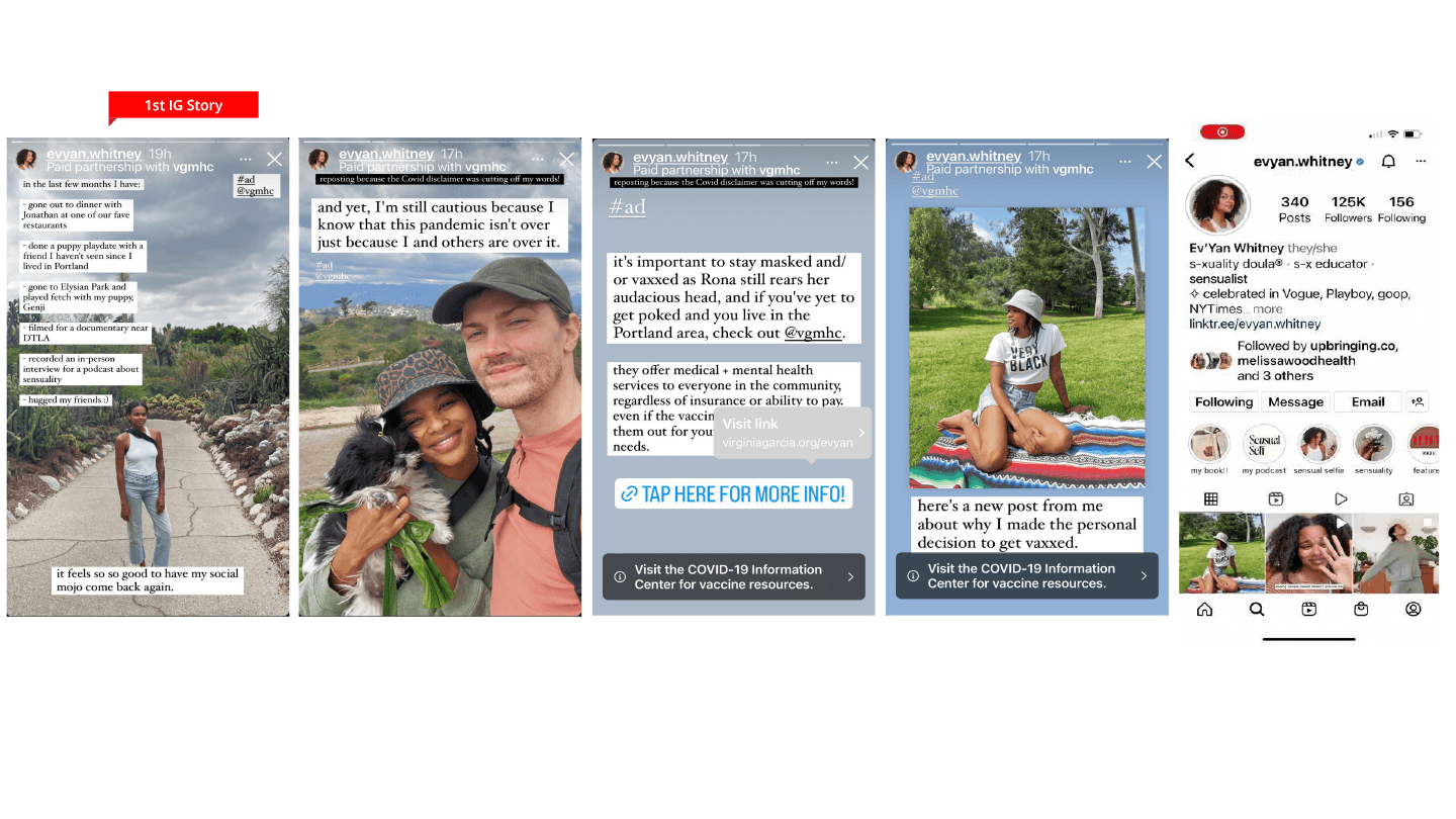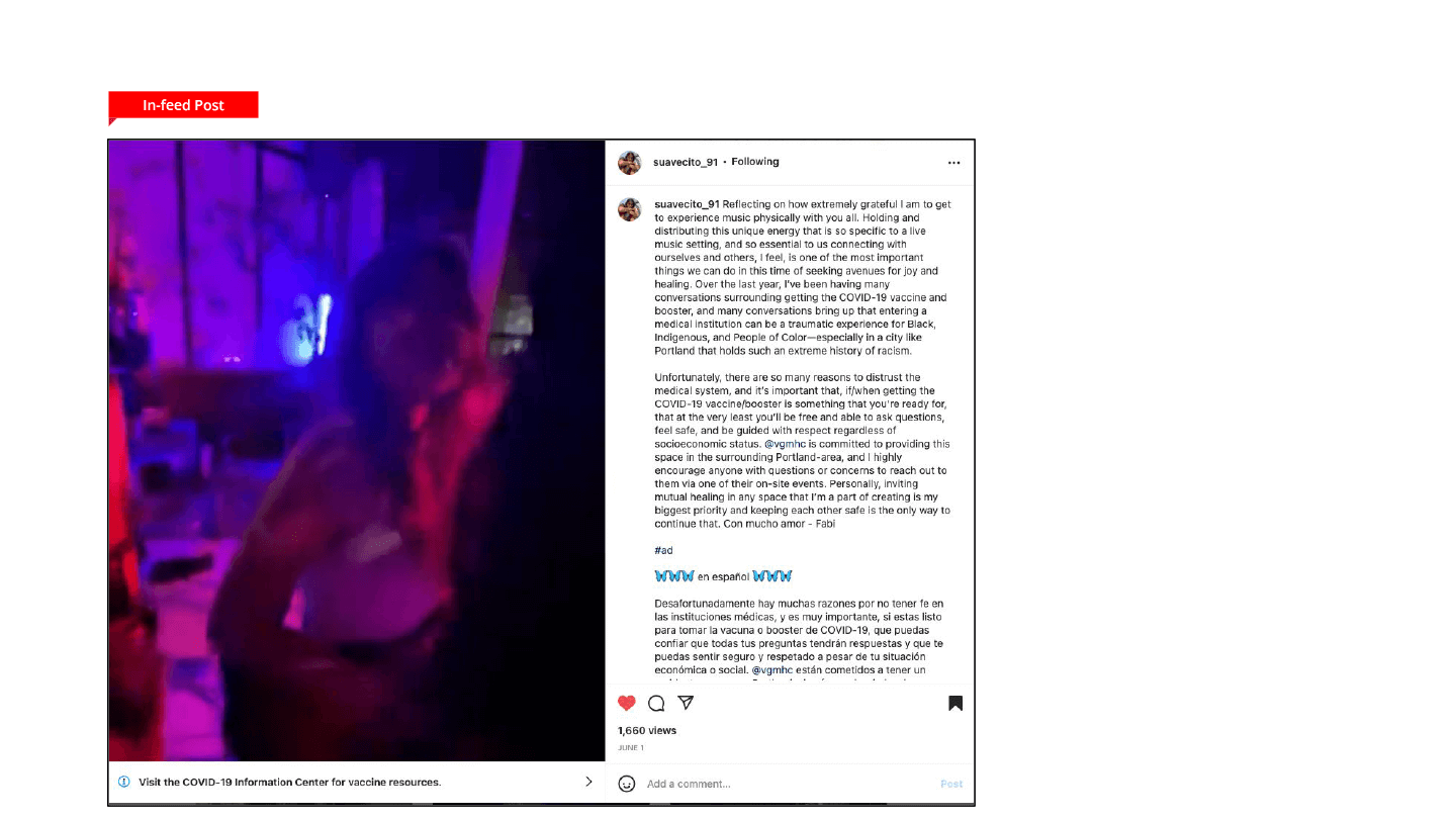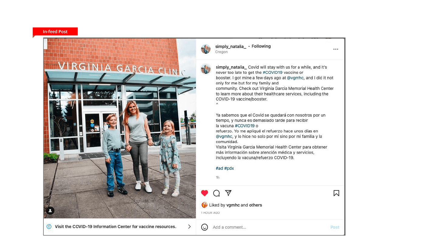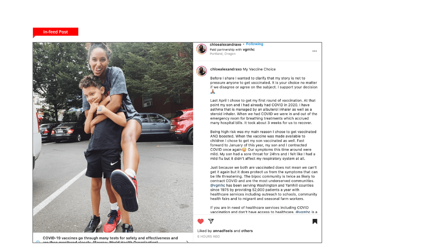 WPR enlisted five influencers with strong ties to Portland. They promoted COVID vaccinations and boosters through the lens of personal choice and individual experience, focusing on Oregon’s underserved communities and touting the work VGMHC provides to them.