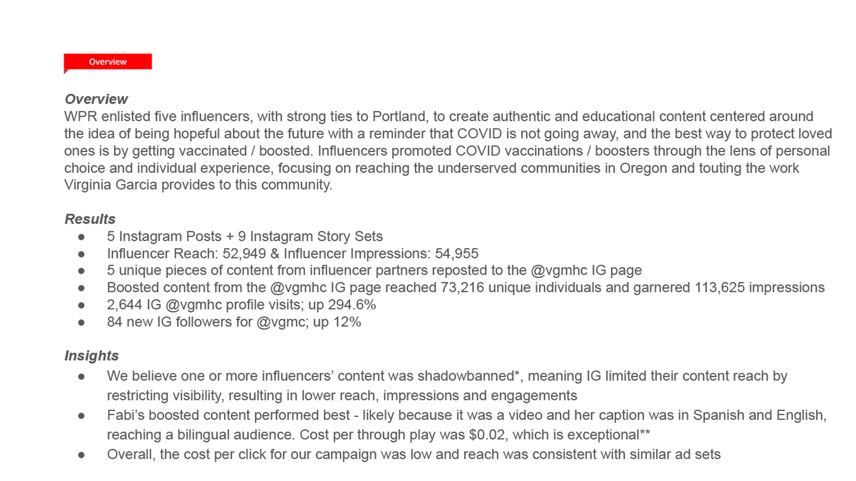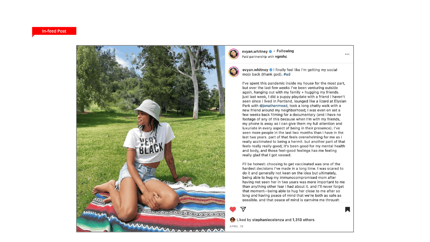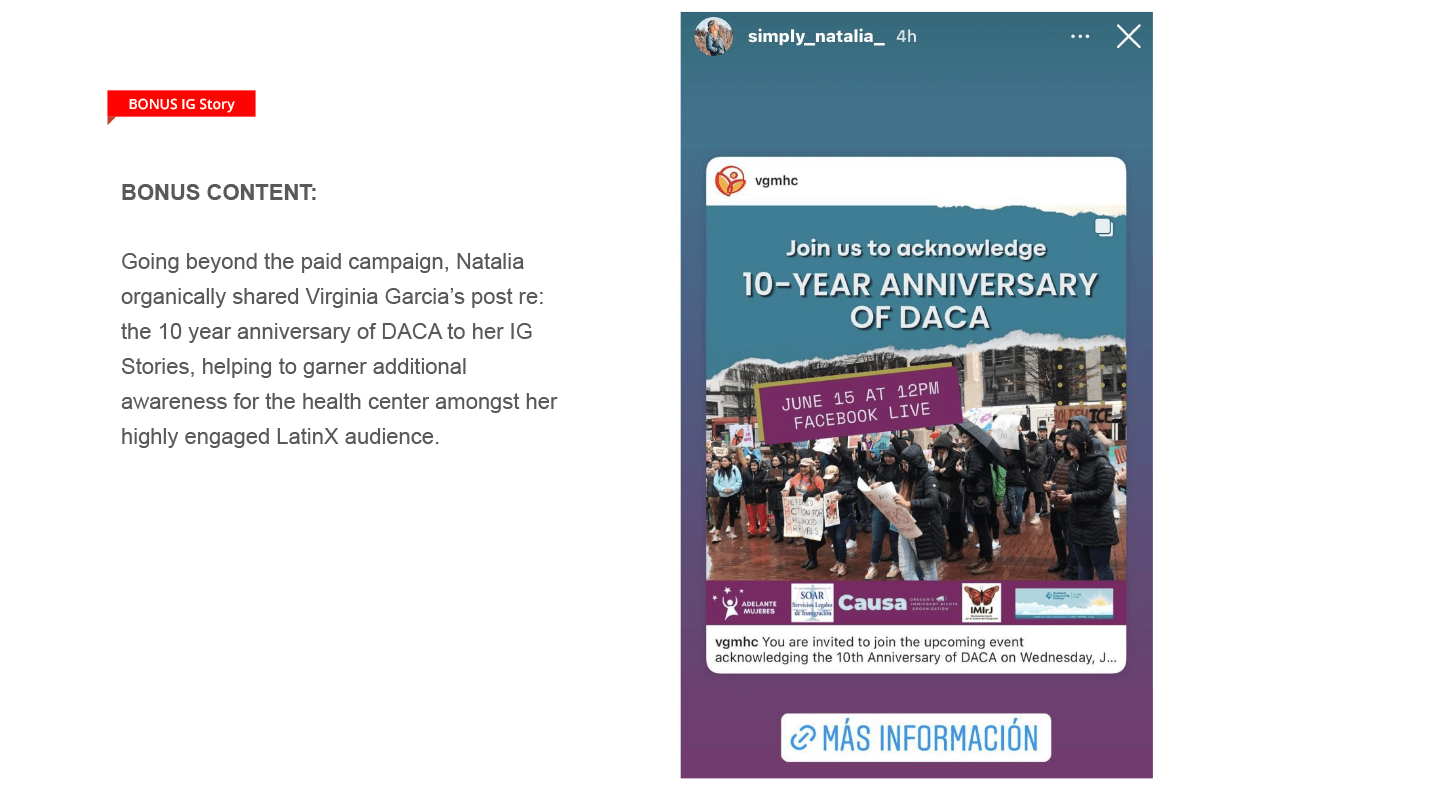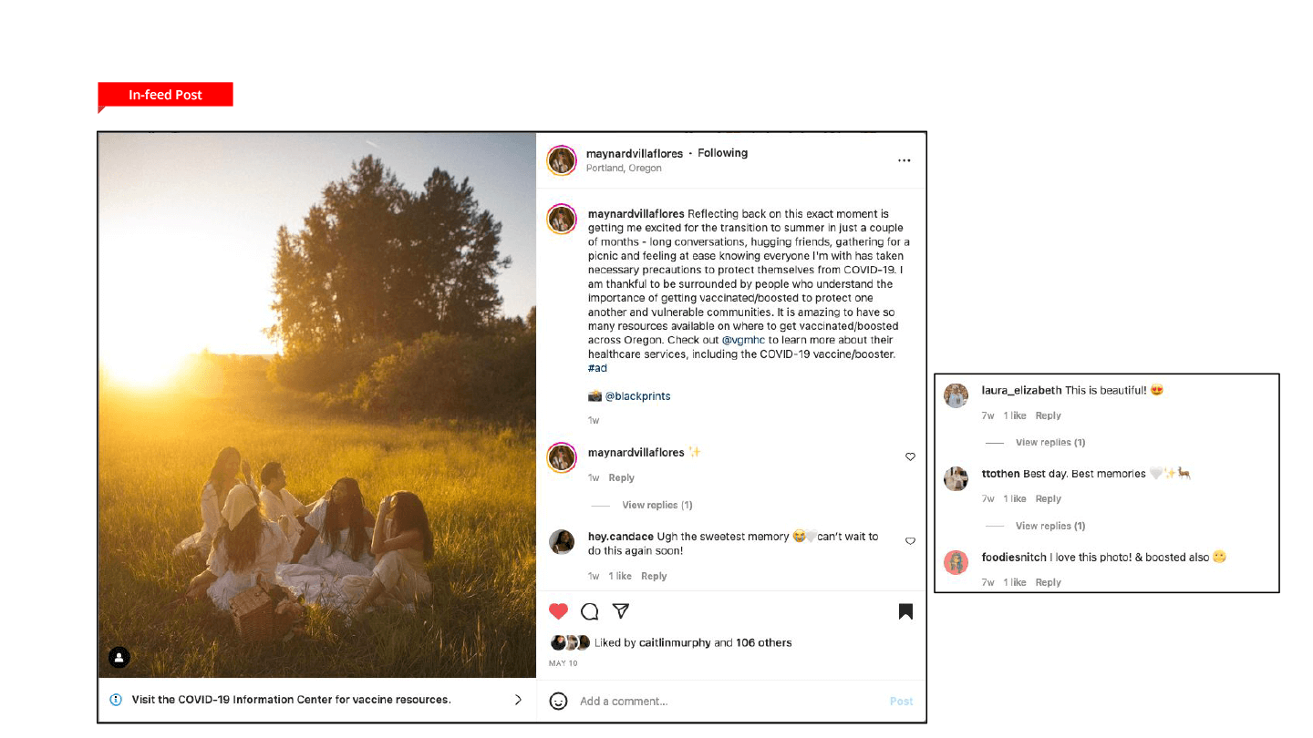 WPR enlisted five influencers with strong ties to Portland. They promoted COVID vaccinations and boosters through the lens of personal choice and individual experience, focusing on Oregon’s underserved communities and touting the work VGMHC provides to them.