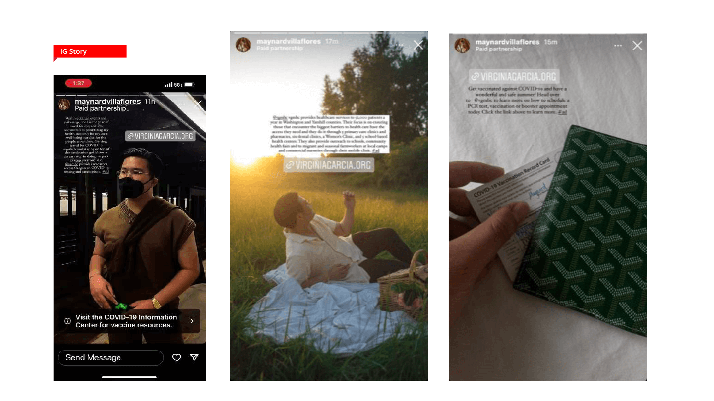 Five Instagram posts and nine Instagram story sets reached 52,949 unique accounts with 54,955 impressions. Boosted content from the @vgmhc IG page reached 73,216 unique individuals and garnered 113,625 impressions. Overall, @vgmhc saw its Instagram audience increase by 12%, with total profile visits up 295%. And most importantly, Oregon successfully shrunk the gap in vaccinated adult Hispanic and Latino adults from 45% in summer of 2021 to 72% in September of 2022.